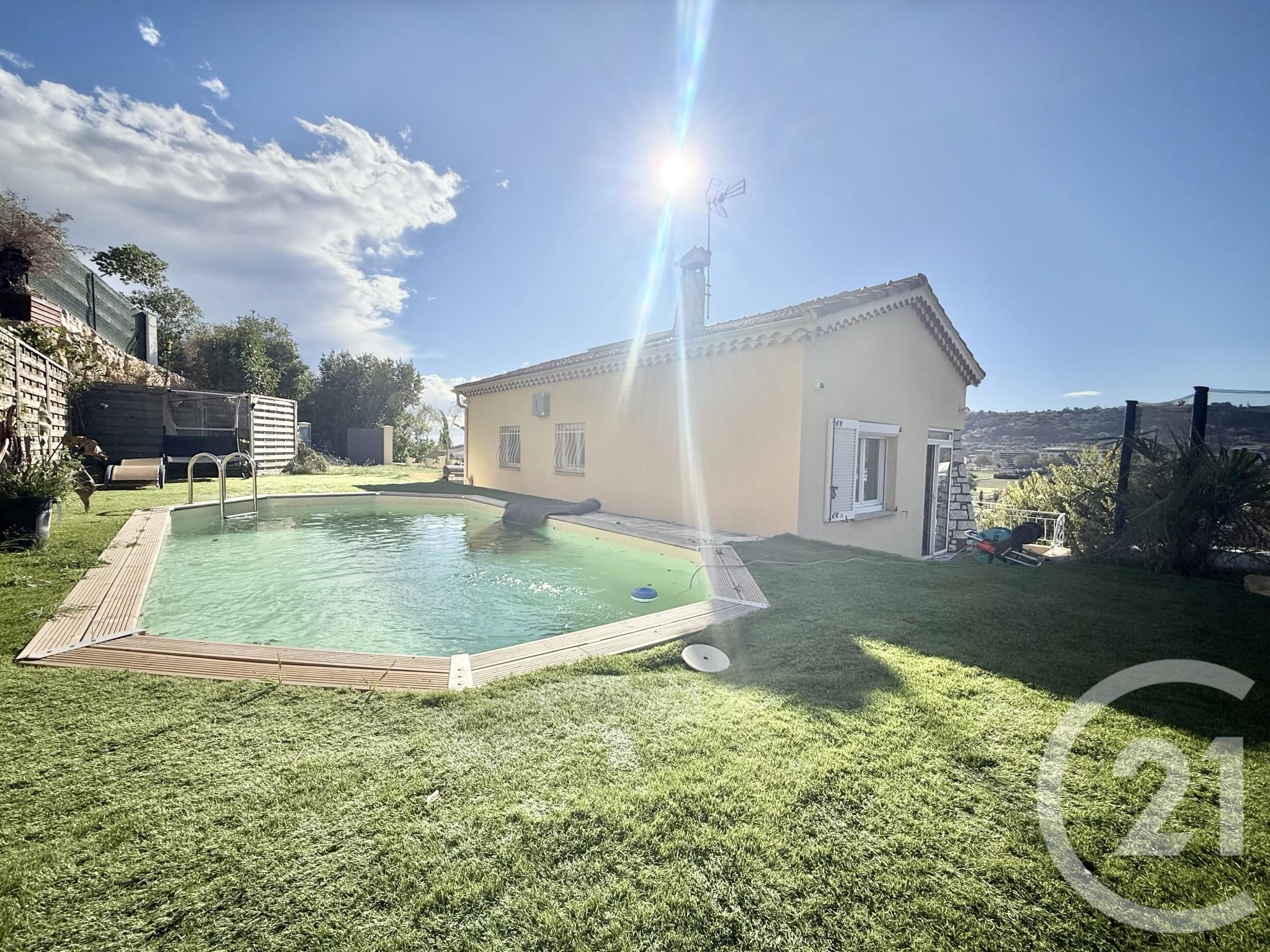 À l'extérieur, un jardin d'environ 400 m², harmonieusement aménagé entre terrasse et coin verdure, permet de profiter pleinement du climat azuréen sans contrainte d'entretien. Une piscine vient parfaire ce cadre paisible, invitant à la détente.
