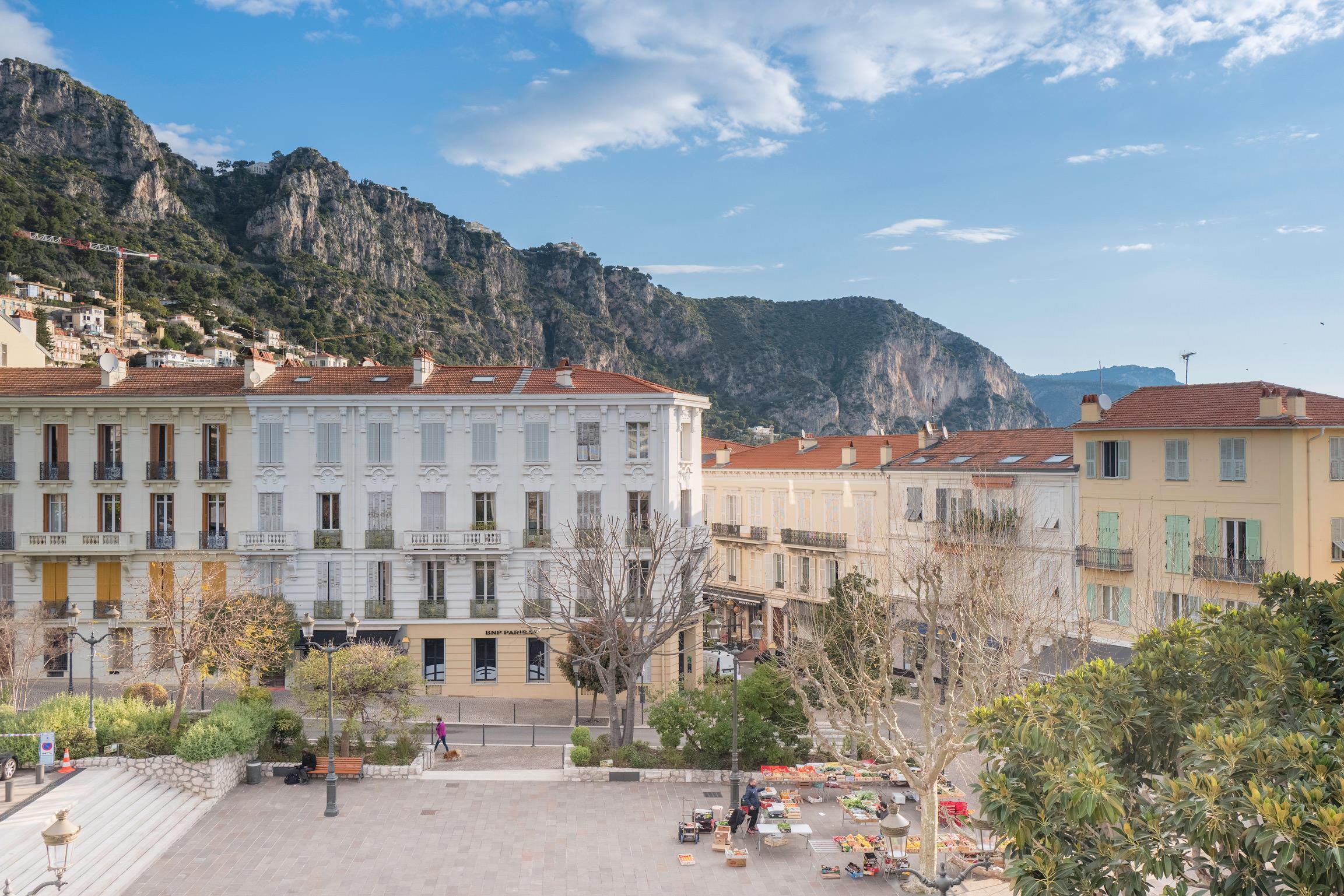 Fully renovated with high-end finishes and furnished with refined taste, it features an open-plan kitchen and a spacious double living area of around 46 m² leading onto a 10 m² balcony overlooking the market square.